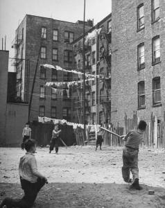 I was a seven-year-old little kid living in the Bricktown section of Jamaica Queens. School was terrible, but once school was out, I played outside. I had pal around with my gang in the neighborhood. We had great fun in the streets. In those those days, there weren’t so many cars so you could play stoop-ball on the street. We’d choose up sides. A garbage can cover, a car fender and maybe a piece of wood were the bases. We used an old broomstick to hit another stick and run the bases.