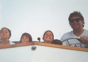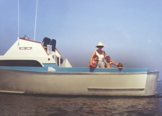 It was a great boat. We spent terrific summers and autumns camping on it, fishing from it, traveling to and from beaches in it. The flying bridge proved to be a great place to escape the noise and that subtle reek of diesel fuel.  It was also an excellent bird’s-eye view of where we were going. Every season’s end, we had it pulled from the water and let it sit as a winter lawn ornament in our yard. Matt spent the spring tinkering, sanding, and polishing. The Boat was not without its issues, but we never needed a tow to shore or had to repair at sea. It served us well. After a year or two, we christened The Boat Tre Sorelle (Three Sisters). It finally got a name proudly painted on its transom.
