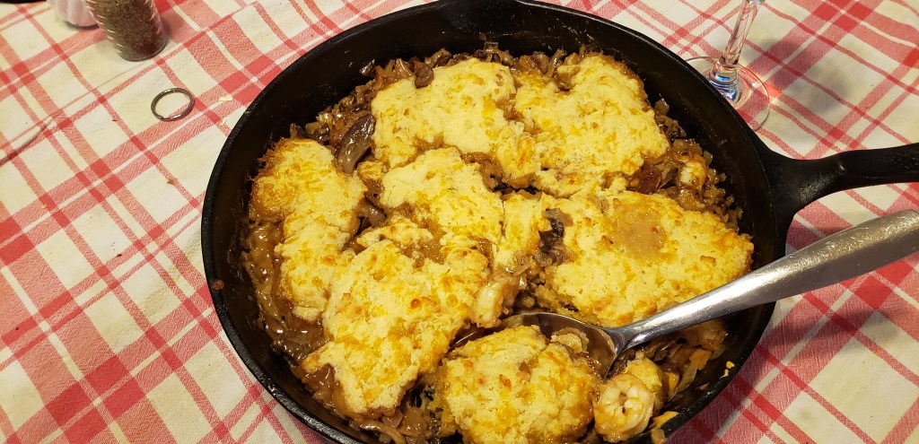 I could not find a recipe that had the mushrooms, a cobblery topping, and shrimp. Eventually, I “cobbled” two attempts that were close. The dried mushrooms needed to soak in warm water for at least two hours and then coarsely chopped. Heavy cream produced a smoother rue than low fat milk. Cheddar cheese in the biscuit mix was savorier than the parmesan. Since the shrimp did not come out of the sea hours before I brought them home, as the shrimp in A Lowcountry Backyard, I had to dress up my frozen cup and half of crustaceans with salt and chili lime seasoning. They were tossed in the cooked down mushroom mix, gently stirred until they started to turn pink. I dropped the biscuit dough on top of everything and popped the skillet into a 350℉ oven until the top browned.