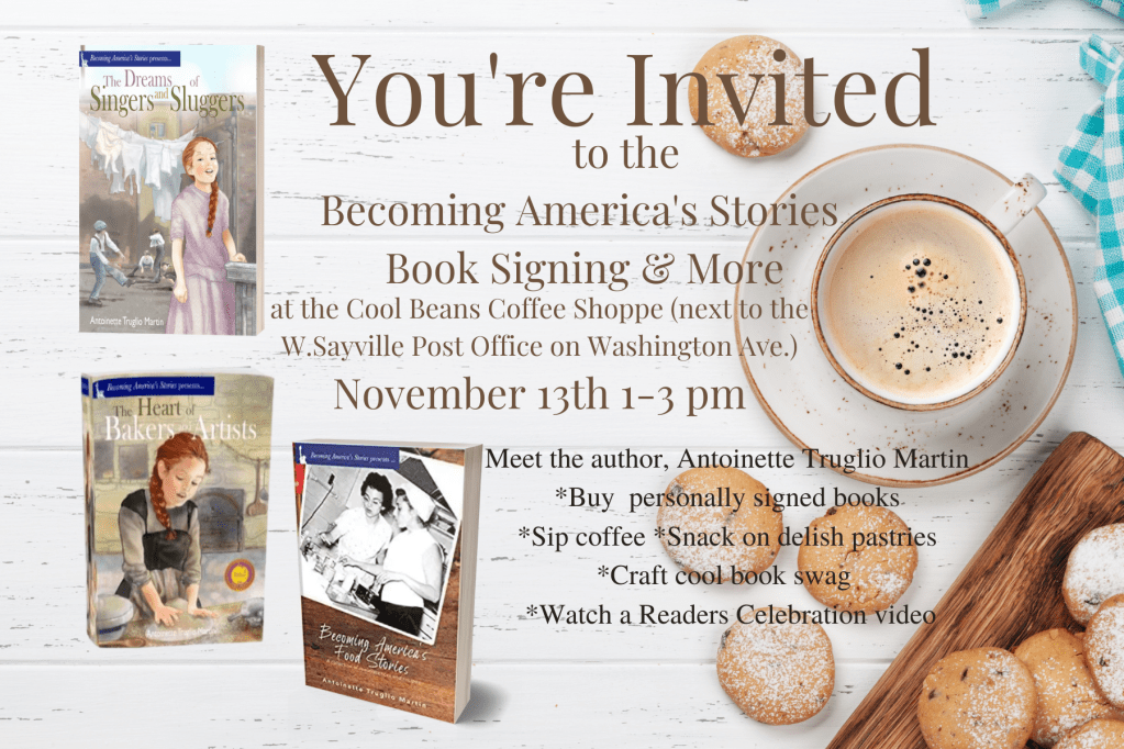 On November 13th, I will sign books while celebrating the publication of the three Becoming America’s Stories books: The Heart of Bakers and Artists, The Dreams of Singers and Sluggers, and Becoming America’s Food Stories at the Cool Beans Coffee Shoppe next to the West Sayville Post Office from 1 to 3 pm. It is a wonderful venue. There will be book swag, simple not-too-messy crafts, and delish coffees, teas and pastries. Come on in, bring the kids, say “hi”, sip a favorite coffee or tea, and buy a book.