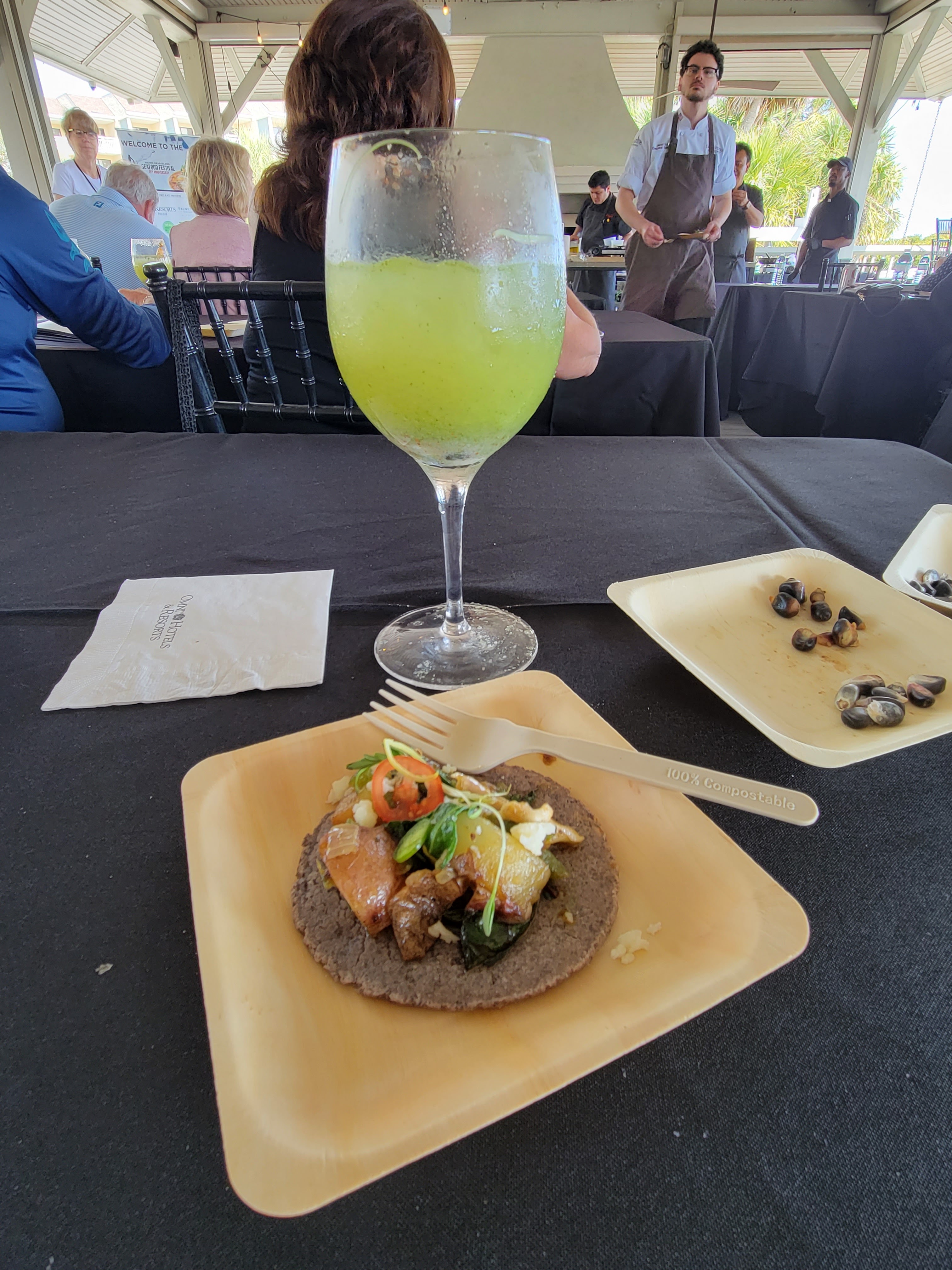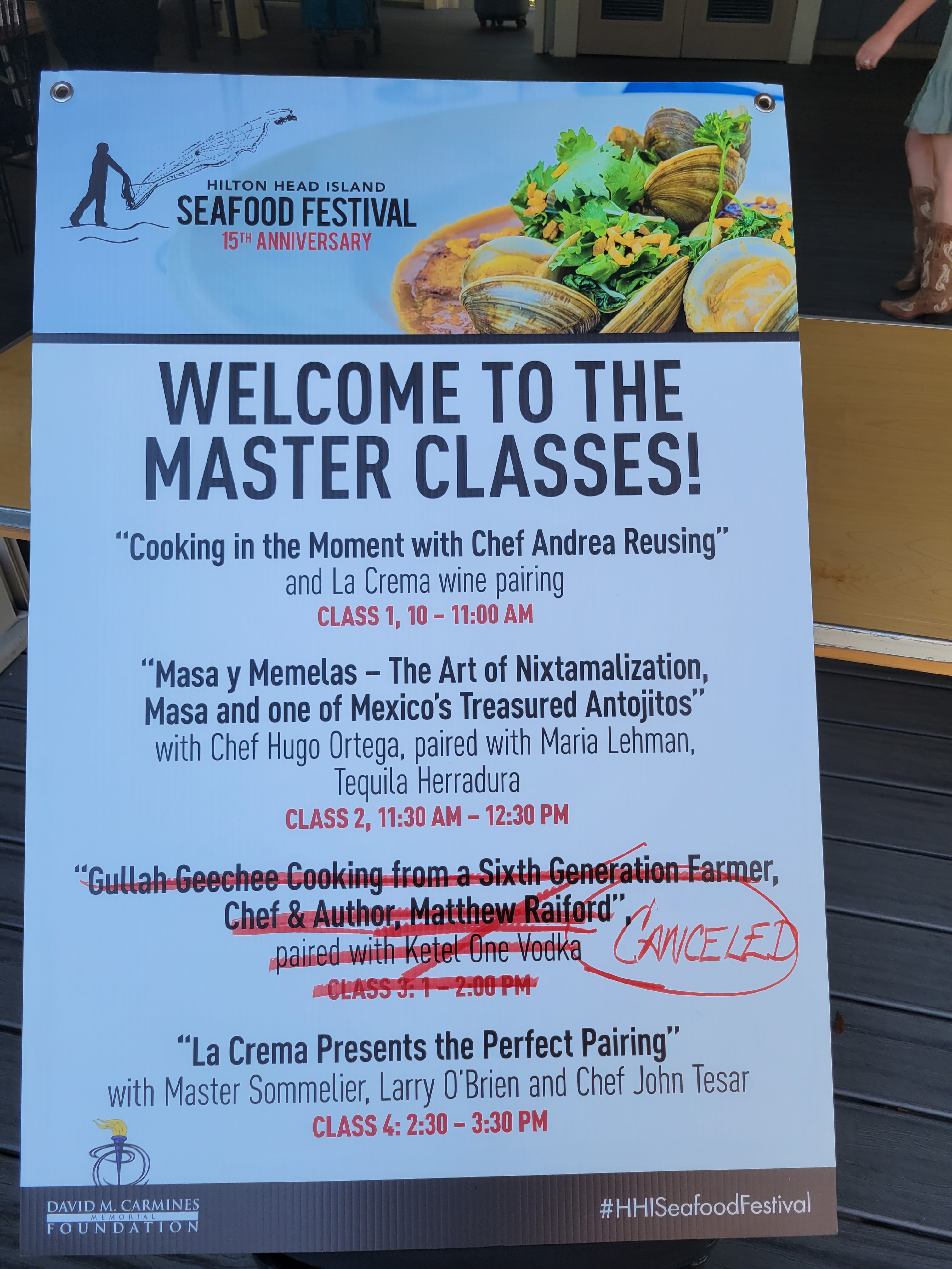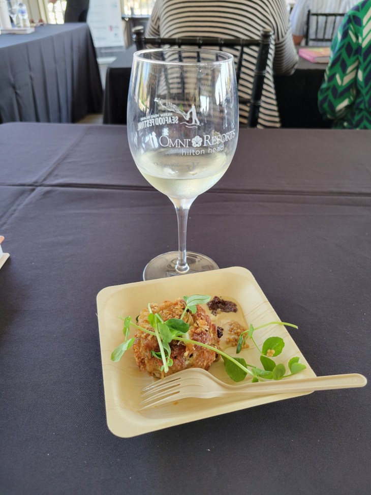 I didn’t cook for #whatsonyourplateblogchallange but I did spend a morning at a cooking demonstration. The Hilton Head Island Seafood Festival was underway a few days before Matt and I drove back to New York. My daughter scored me tickets to the Master Classes at the Omni on Ocean Lane. It was a lovely outdoor setting, complete with a light ocean breeze under a shaded patio.