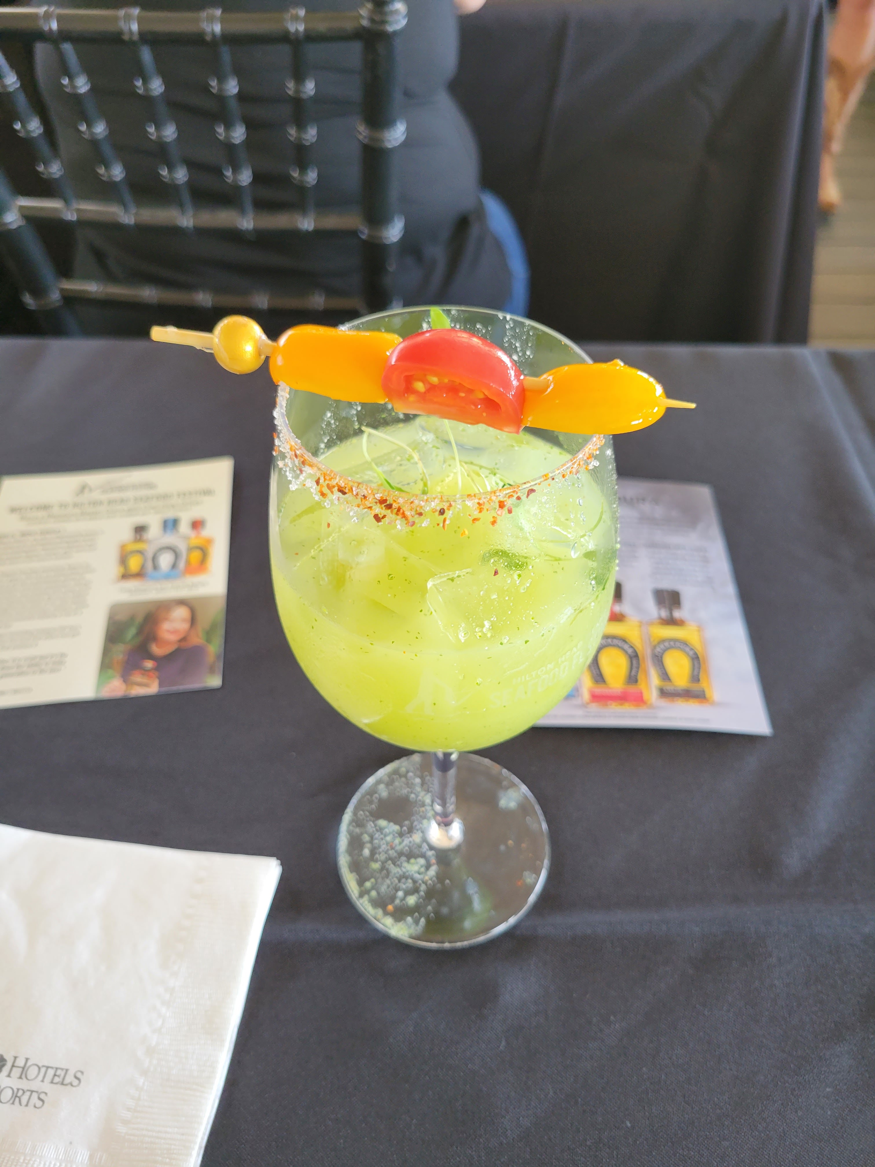 Next was Chef Hugo Ortega, who told a fascinating story of his culinary roots, cooking with his abuela in Mexico and saying “yes” to all opportunities that crossed his path. He grounded corn and mixed, shaped and baked the tortilla. A tasty combination of swiss chard, mushroom and potatoes filled the blue corn tortilla (no one said anything about the missing seafood). The dish was paired with a delightful Margarita, concocted by Maria Tequila herself, the Herradura Tequila representative. OMG! The drink not only looked festive, it was amazingly delightful. I’ll NEVER go back to Margarita mix Margaritas again.