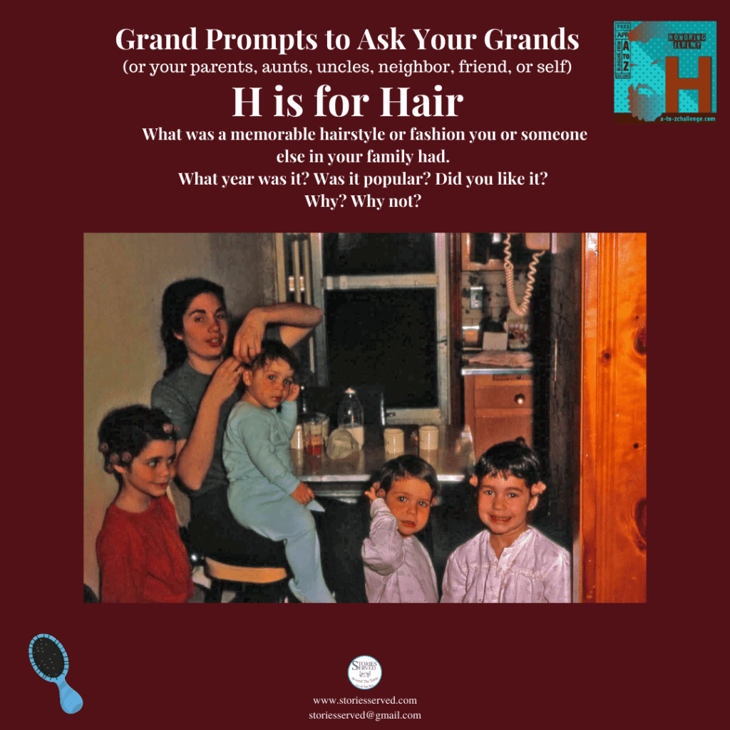 My theme for the 2022 AtoZ Blog Challenge is titled Grand Prompts To Ask Your Grands. Each day in April I will present a conversation starter/journal prompt to ask your parents, grandparents, aunts, older neighbors, co-workers, yourself…you get the idea. The questions are meant to forge connections between and within generations and inspire storytelling and journaling.