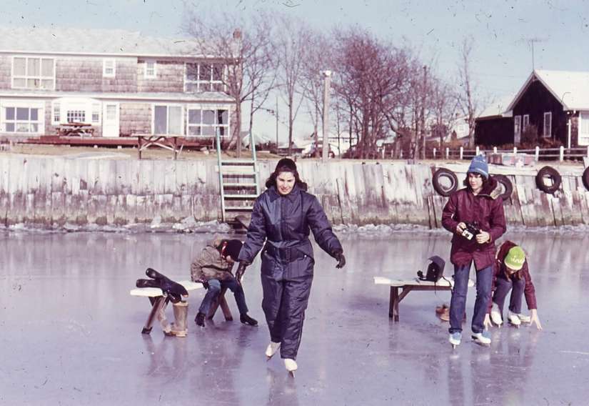 Dad placed a plank between the bulkhead and firm ice. Neighborhood friends joined us. There was plenty of room for a hockey game, screeching lines of crack the whip without falling dangerously close to edges, speed skate races, and attempts to spin like Peggy Fleming. The bay never froze smooth, so there were skips to dig into and moguls to jump over. We skated until we couldn’t feel our hands and feet and the tide changed, making our plank pull away from the bulkhead.