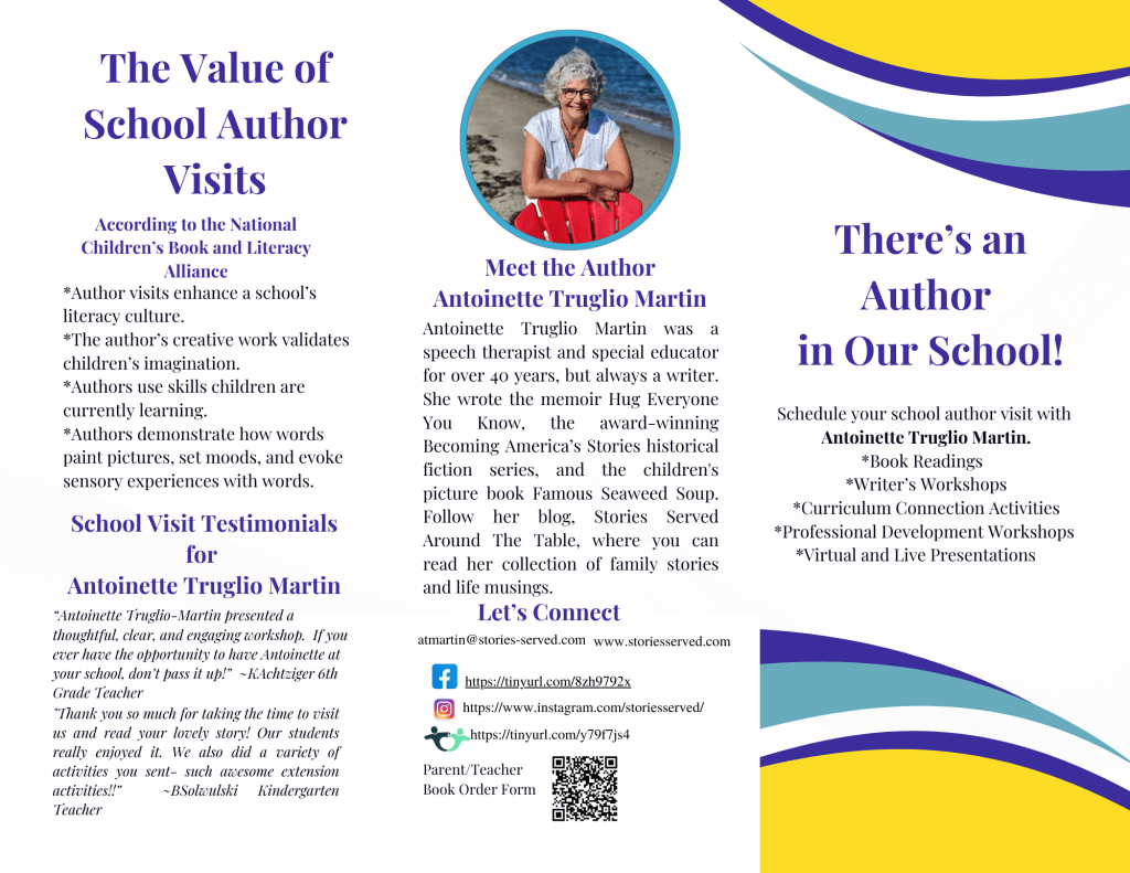 “I want to recommend Antoinette Truglio-Martin for an author visit. She is a thoughtful, clear, and engaging presenter. She spent a class period at our school and did a fantastic job with my sixth grade students. She inspired all of us to write. She also talked about her writing and the publishing process. She shared a chapter of one of her books with my students. She took the time to answer any questions my students had regarding the writing process. If you ever have the opportunity to have Antoinette at your school, don’t pass it up!” ~Kristin Achtziger 6th Grade Teacher Milton L. Olive Middle School Wyandanch, NY